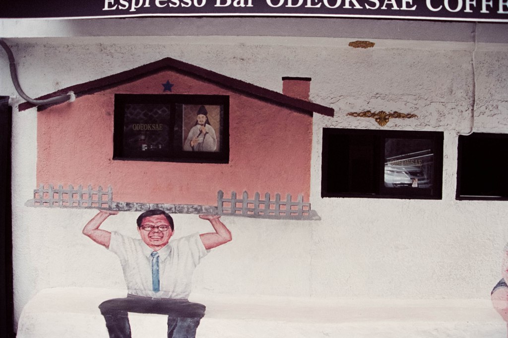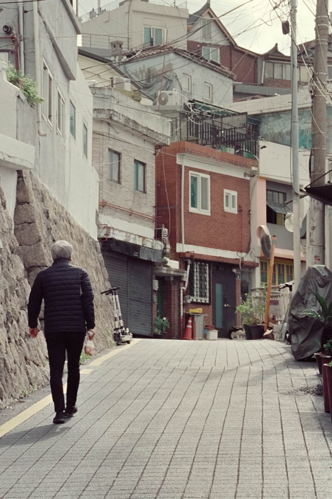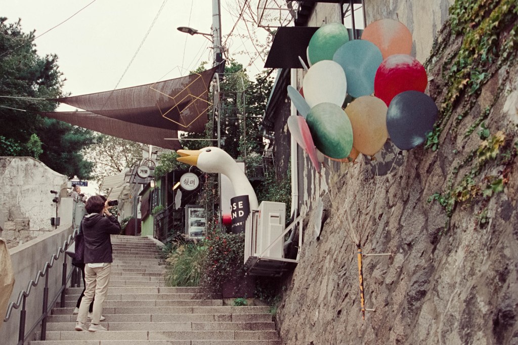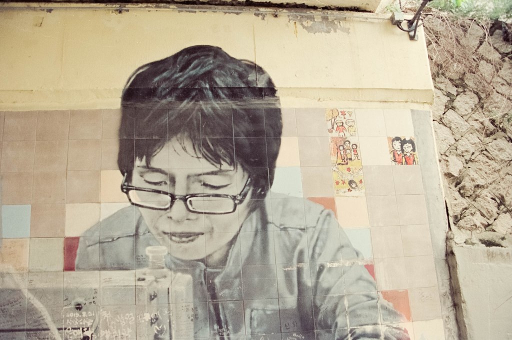 I grabbed my Nikon FE film SLR and my Nikkor 35-200mm manual focus lens and headed out on the South Korean Subway to Ihwa Mural village – just one change and a few stops from where I was staying in Myeongdong but a place with a very different vibe. Nestled on the side of Mt Naksa, it’s a fairly quiet residential area, skirted by the ancient walls of the city and now fairly well known for its street art, which was painted as part of an urban renewal project in the early 2000s, though some of them have been painted back over again because the locals didn’t like the influx of tourists who descended on the community. Or let’s face it, wannabe film photography YouTUBERS.